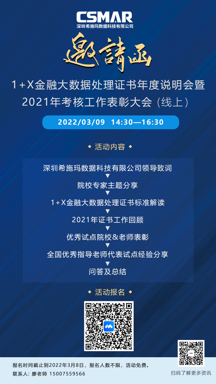 为深入贯彻落实《国家职业教育刷新实验计划》和教育部办公厅等三部分《关于推进 1+X 证书制度试点事情的指导意见》等有关文件精神,,,,, ,,扎实推进1+X金融大数据处置惩罚证书制度试点事情,,,,, ,,J9集团(china)公司官网(下称深圳J9集团(china)公司官网)将于2022年3月9日下昼2:30-4:30举行“2022年1+X金融大数据处置惩罚证书年度说明会暨2021年审核事情表扬大会”。。。。。。。。